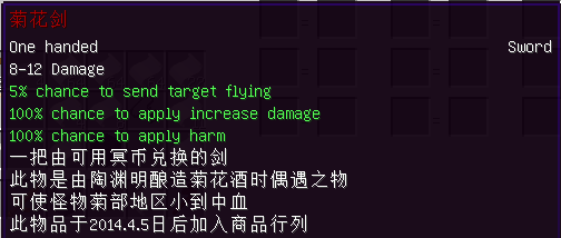 【菊花剑】图3:一把由可用冥币兑换的剑,此物是由陶渊明酿造菊花酒时偶遇之物。攻击力偏高,耐久度堪比钻石剑,可使怪物菊部地区小到中血。此物品于2014.4.5日后加入商品行列。