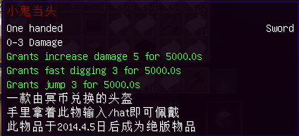 【小鬼当头】图2:一款由冥币兑换的头盔,手里拿着此物输入/hat即可佩戴,可永久提升玩家的移动速度,攻击力,此物品于2014.4.5日后成为绝版物品。