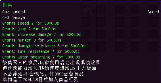 【供果】图4:祭奠死人的食品,玩家食用后会出现饥饿效果,但跳跃能力增加,移动速度爆增,攻击力增加,不会淹死,不会烧死。打BOSS必备食品,此物品于2014.4.5日后加入商品行列。